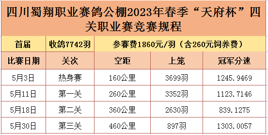 然而接下来的比赛才是残酷考验的开始。5月18日,2630羽将士兵发四川广元,天气预报播报的是大晴天,放飞不久后却遭遇天气突变,突降中雨,这不仅让公棚、鸽友仿若遭受“晴天霹雳”,更让赛鸽小将们措手不及。沿途的中雨从上午一直持续到傍晚,一路飞,一路雨,让360公里的飞行尤为艰难,最终仅有23.46%的赛鸽归返。 5月30日第三关460公里,897羽小将再遭高温暴击,当天司放地、沿途多地气温均达到5月最高值,如四川遂宁当天温度37℃,此外,部分地区伴有小雨,酷热加上雨前闷热,让本就艰难的飞行路线变得更具难度。经过焦急的等待,廖启军的一羽22-1966606灰花登上冠军宝座,分速1303.0057米/分。最终两日归巢191羽战鸽,不少赛鸽披荆斩棘,夜行而归,第191名归巢时间为22:50:23,真正展现英勇川鸽不死必归之精神! 办实实在在的公正比赛 树脚踏实地的赛鸽品牌 四川蜀翔赛鸽公棚2022年6月盛大开业,坐落于四川省隆昌市云顶古镇。公棚整体呈一字型构造,公棚总长160米,总宽24米,可容纳约两万羽赛鸽。棚内设计采用现代化、科学化的建设体系进行构建,具有良好的通风性、防疫性、便清洁、便训放、便竞赛的功能。“每一只赛鸽都是我们的孩子。”公棚首届收鸽7442羽,设置10辆免费汽车、高达1066个获奖名额回馈鸽友,同时每收费一羽,提取10元用于慈善公益事业。 四川蜀翔2023年春赛不仅是全川唯一获准举办“天府杯”的比赛,由省鸽协举办和监管并由省体育局备案,同时采用全球最稳定的德国托瑞斯扫描计时器(天津开创同款),确保比赛公正性。此外,100%尊重规程、执行规程,即使归巢不好,也完全按照规程办事。四川蜀翔用行动真正做到“让每一位参赛者感受到比赛的公正”。 英勇川鸽不死必归,191羽将士等你来选。6月24日,四川蜀翔职业赛鸽公棚将携决赛优胜鸽开启获奖鸽颁奖暨拍卖盛典,届时还联合中信网开启“现场与网络同步拍卖+视频直播”服务,鸽友们可登录中信网,提前出价拍好鸽,边看直播边竞价,冠军奖鸽带回家!即刻下载中信网手机APP,轻松出价,快人一步!