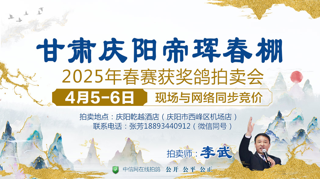 拍卖时间:4月5-6日 拍卖地点:庆阳乾越酒店(庆阳市西峰区机场店)古象西路24号 联系电话: ①接站服务专线:17693465678,杨柏枫(微信同号) ②住宿服务专线:15393415555,张红涛(微信同号) ③网拍联系电话:18893440912,张芳(微信同号) 拍卖方式:网络拍卖+现场+视频直播 媒体支持:中国信鸽信息网 拍卖顺序:4月5日13点,拍卖决赛500-401名、附加赛获奖鸽75名-冠军(18点举行颁奖盛典晚宴) 4月6日8:30,拍卖决赛400名-冠军(历时一天) 【运费说明】 1、运费说明:运输费与竞拍款一并支付,买家现场自提免运费; 2、火车/汽运:100元/羽,同一买家同一收货地址得标3羽及3羽以上免运费; 3、需要空运的请提前联系,空运运输费用以实际运费为准(联系电话:18893440912,张芳(微信同号); 空运不包邮,无论得标多少羽,运费由买家承担。 【注意事项】 1、买家必须自行到指定机场或长途车站取鸽,无法直达须中转加价另议! 2、运输费用为托运公司最低收费标准,不议价且不包含到达后寄存费用! 【温馨提示】 1、本场为网络现场结合拍卖,商品的具体结标时间,以现场拍卖师宣布落槌时间为准,请注意观看现场直播视频,网上预出价已开放,欢迎各地鸽友参与竞拍。 2、健康问题:鸽子运达时若发现严重生病或死亡须2小时内通知卖方登记备案,未及时报备病况或未立即通知死亡状况者,卖方将无法做出任何补偿。 3、本场为网络现场结合拍卖,无法提供血统书、足环证,不支持退货退款,一旦出价视为同意该条款。 4、请参加拍卖会的外地鸽友提前致电拍卖方,以便安排食宿。 5、获奖鸽主本人需携带身份证登记领取奖金,并提前将血统书传真至拍卖方。 6、本场拍卖商品启用的是比例保证金模式,请注意事前在会员账户内转入足额保证金,以免在现场与网络同步竞拍激烈时因保证金不足无法出价,错失获得爱将之机会! 7、本场拍卖支持现场取鸽,网上得标的鸽友可以委托朋友代为现场取鸽。 步骤:买方登录会员区拍卖订单页面→付款结算订单→点开订单编号→获取验证码→交由主办方验证→签发取鸽凭证,交接拍卖鸽→订单交易成功。 不会网络拍鸽?点击查看→网络同步竞拍帮助 不懂现场取鸽?点击查看→现场取鸽详细流程 以“公”为立身之本,十三届老棚办赛风雨无阻 甘肃庆阳帝珲自成立以来,已成功举办十三届赛事。公棚位于甘肃省庆阳市,地理位置优越,交通便利,生态优美,是适宜赛鸽栖息飞翔,举办赛鸽竞技的理想之地。公棚总占地60余亩,面积达5000余平米。主棚共37间,采用开放式通棚设计,鸽舍内采用高档樟木栖架15000个。四周万亩绿色植被,无高层建筑,具有得天独厚的信鸽竞翔环境。 帝珲赛鸽公棚始终以“公”为立身之本,持之以恒做好“公平、公正、公开”。致力于打造出中国西部独具特色的好公棚。本届参赛费2800元,决赛奖励1000名,冠军奖金80万元、亚军30万元、季军20万元。 四场大赛关关稳,激情加战俏争春 今年甘肃庆阳帝珲公棚收鸽16085羽封棚,随后便马不停蹄地开启训放家飞,1月18日,100公里收费站打响,首炮出击便拿下超九成归巢战绩。2月17日正赛开启,200公里、300公里两关连战连捷,归巢率均亮眼。3月7日,400公里预赛开启,4732羽赛鸽迎战。本关前半程风向多变,但战至此处,帝珲小将们已然是渐入佳境。最终超九成赛鸽凯旋,青海湟中腾翔鸽舍-李友明麾下猛将28-0160732灰鸽夺冠,分速1622.3817米/分。 3月17日,510公里决战正式打响,4280羽赛鸽出征甘肃省武威市凉州区,经过6个多小时的飞行,天甘肃庆阳大巴黎·张益豪的赛鸽抢先报进,分速1292.9926米/分,夺下决赛冠军。这羽赛鸽前几关的名次都在千名之外,最终在决赛关一鸣惊人,可谓是全场最大黑马!上海邹建人麾下大将09-0209487灰鸽紧随其后,拿下决赛亚军。肃庆阳协力鸽舍·郭岩昊的灰鸽则拿下决赛季军。决赛过后,鸽王冠军也水落石出,新疆乌苏王玉国麾下30-0635558雨点以热身赛28名、预赛11名、决赛56名,加冕三关鸽王冠军。鸽主王玉国今年在帝珲收费仅一羽,最后这羽赛鸽一路过关斩将拿下三关鸽王冠军。实在是实力非凡。 四关不尽兴,2269羽于3月24日再度出征600公里高难度挑战赛,最终快速报满,甘肃帝珲第十三届比赛圆满落幕。