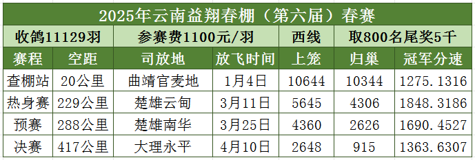 | 开始时间:2025-04-26 08:00:00 | 发布:云南金跃赛鸽团队 |