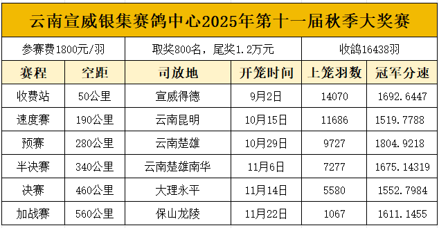 十一载风云铸强豪,两万精兵入云霄。 赛场争霸风云会,金榜题名看今朝。 云南省宣威市银集赛鸽中心2025年第十一届秋赛,收得稳、战得狠、归巢准。收鸽共1.6万羽,打到决赛还有近六千羽上笼,养训实力可见一斑。赛鸽们挑战四关,再算上加战赛,飞行总空距将近两千公里。从速度赛到半决赛,三场正赛归巢率从未低于七成。难怪鸽友们信任,好的赛鸽,实力都是一关关飞出来的。决赛结束,鸽主龙翔问鼎-王维梅的2025-24-0122528灰,成绩1552.7984米/分,斩获冠军。鸽友穿云破雾-赵利的一羽2025-24-1232226灰,四关成绩优异,获得一关26名、二关49名、三关239名、四关21名,获得四关鸽王冠军、三关鸽王冠军。 机会不是天天有,该出手时就出手!12月6日,云南省宣威市银集赛鸽中心将举行2025年获奖鸽颁奖暨拍卖大会,届时还联合中信网开启“现场与网络同步拍卖+视频直播”服务,鸽友们可登录中信网,提前出价拍好鸽,边看直播边竞价,冠军奖鸽带回家!即刻下载中信网手机APP,轻松出价,快人一步! 点击链接,抢拍好鸽! 云南省宣威市银集赛鸽中心(秋棚)2025秋决赛101—200名 云南省宣威市银集赛鸽中心(秋棚)2025秋决赛201—300名、926