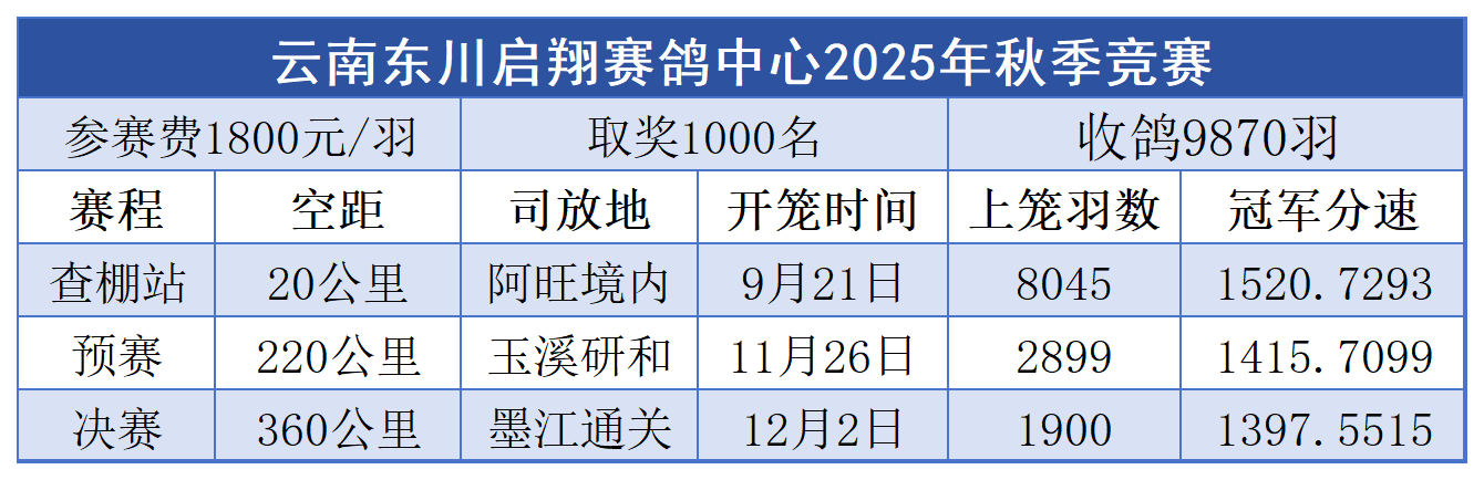 云南东川启翔赛鸽中心2025年秋获奖鸽12月14日同步拍卖会